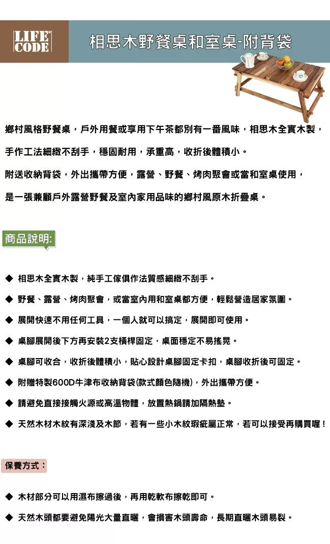【LIFECODE】相思木野餐桌和室桌-附背袋 評價
